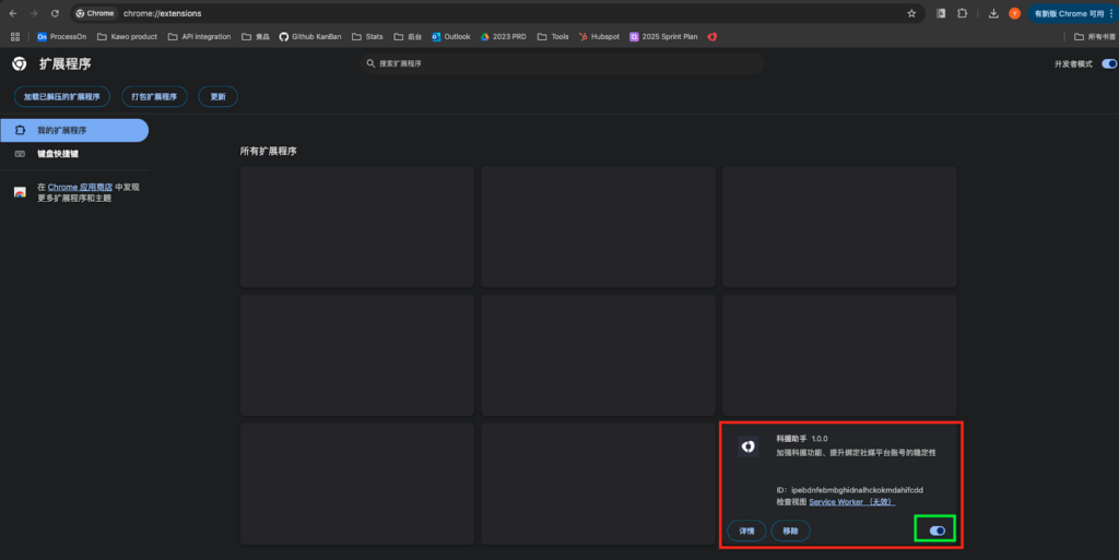 - 安装成功后,您可以在这里找到安装好的KAWO助手扩展程序:chrome://extensions/