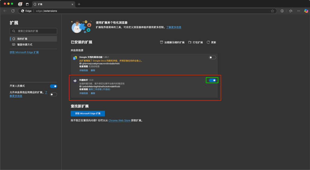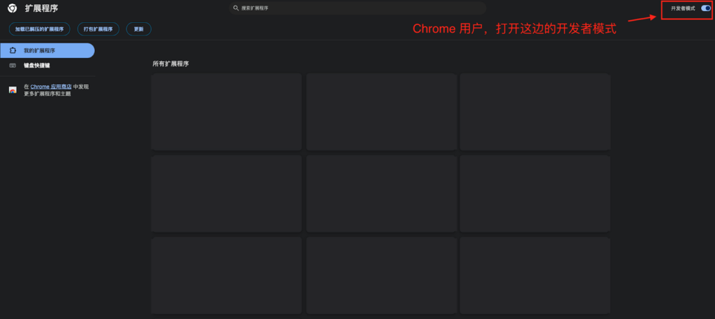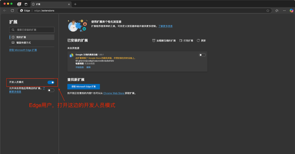 - 在打开扩展程序安装页面后,请打开开发者模式 (Chrome)/ 开发人员模式 (Edge)。