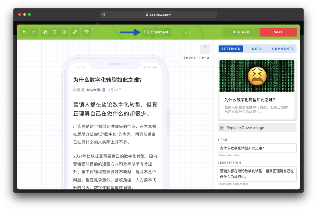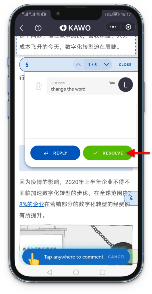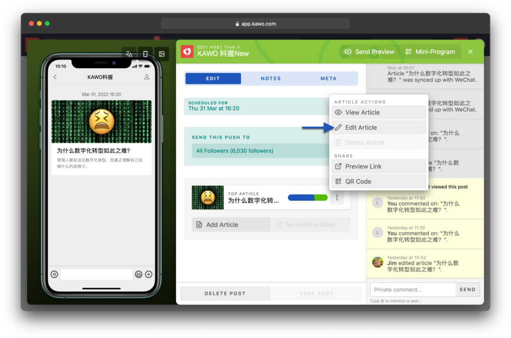 相比于微博、抖音、快手,微信文章通常有着更长的篇幅,因此审批微信文章的流程也要复杂许多;中国团队沟通修改文案主要依靠微信群:截图、引用、划线、语音……有些重要的文案还需要层层邮件确认。这样跨平台的流程特别容易碰到重要信息遗漏、发错群、消息追溯不到等问题。使用科握,您可以对微信文章的不同段落或图片分别进行留言反馈,从而可以更加直截了当地跟踪修改进度。