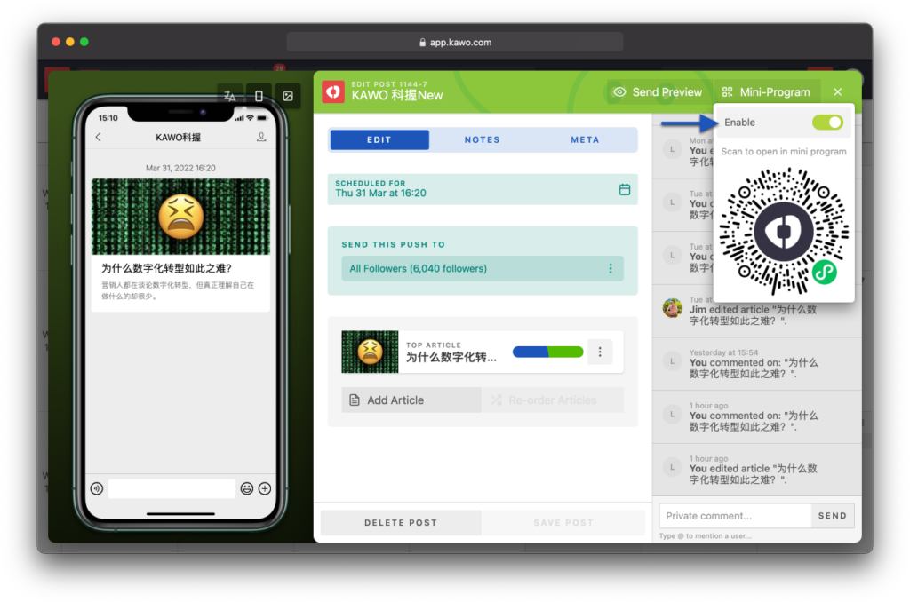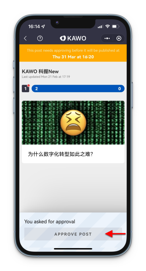 科握微信文章审批流程可在电脑端 app.kawo.com移动端的微信小程序中进行。