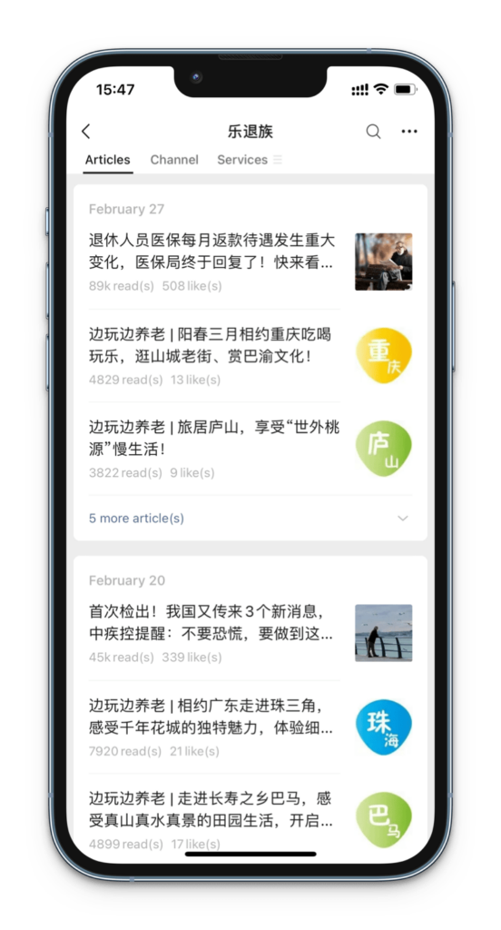 Long-term senior followers of its WeChat OA have helped the brand maintain 30k+ average reads for each main article. In addition, articles continue to receive views long after publishing, signaling that followers continue to grow and that users continue to come back to this channel for news and info.