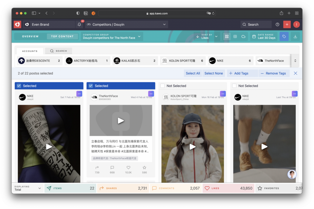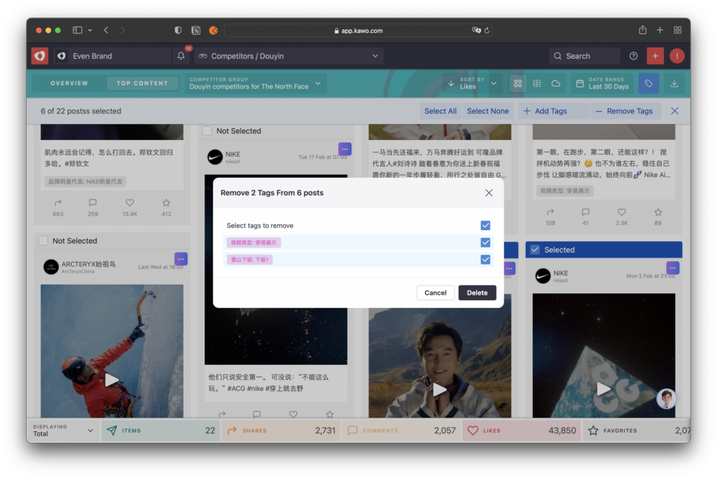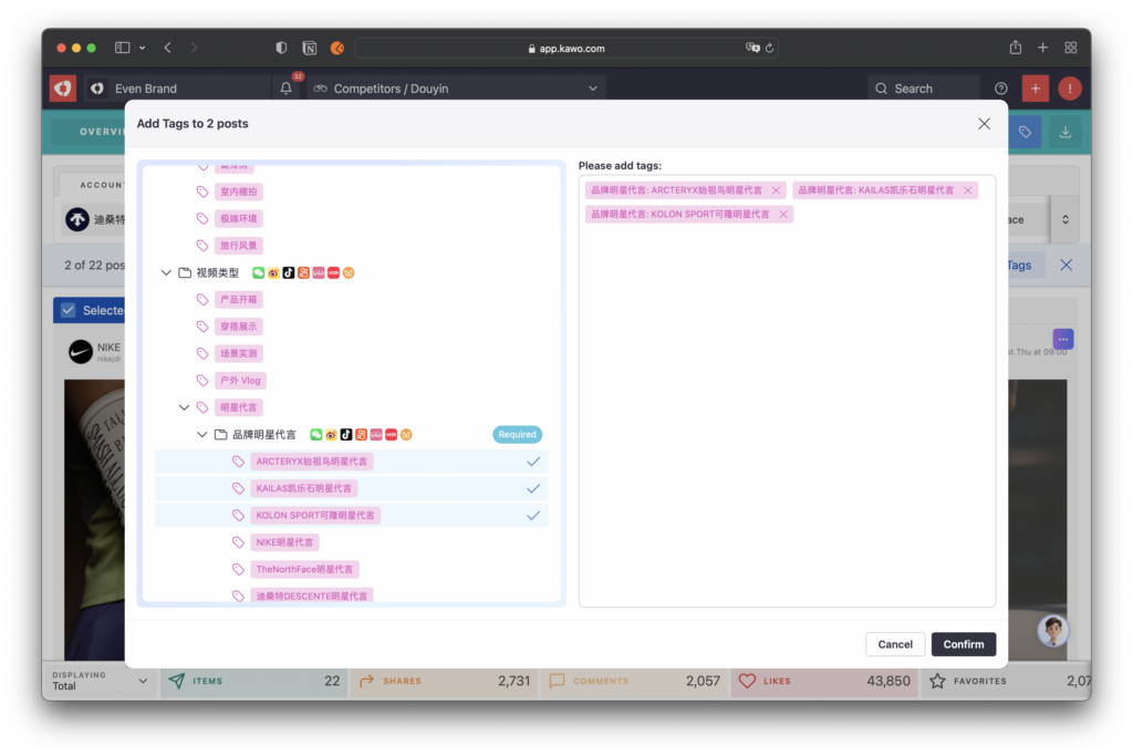 Click the Add Tags button. In the pop-up window, select the desired tags and click Confirm to apply the tags to the selected posts.