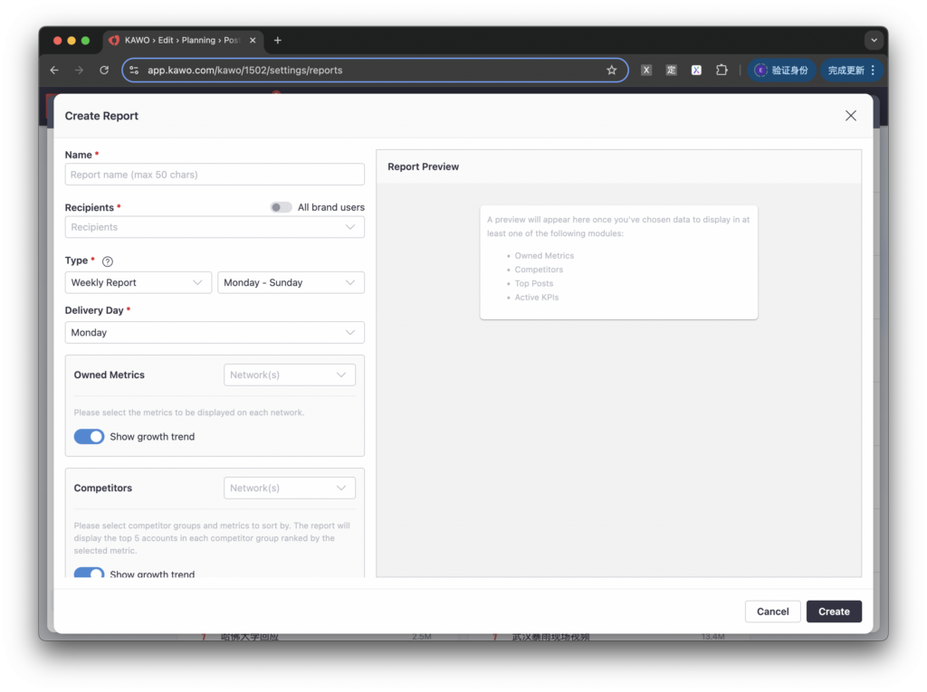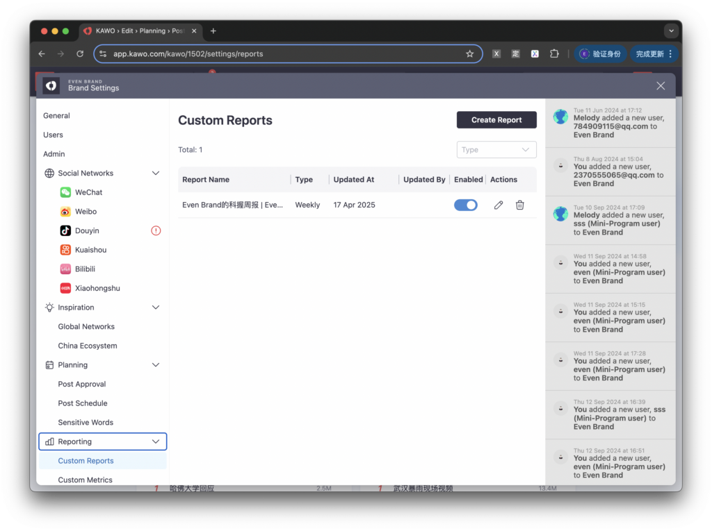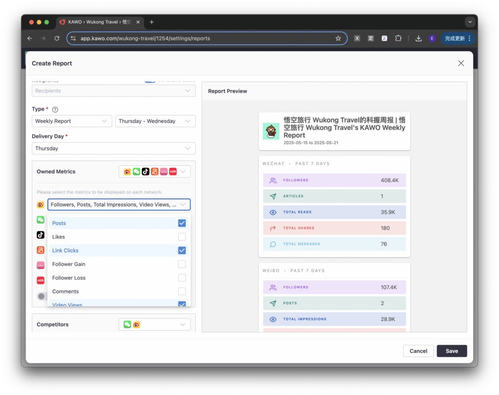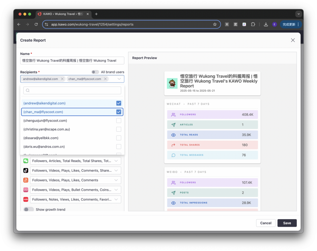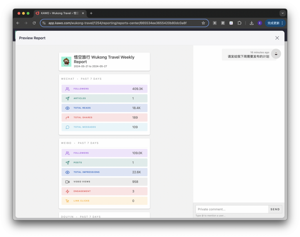 No need to manually integrate data to create reports. KAWO will automatically generate weekly or monthly reports based on the report templates you create, including social media account data, competitor data, top-performing posts, and KPI achievements, and send them to your email automatically. It supports real-time comments and @mentions to timely review data with the team and gain new insights.