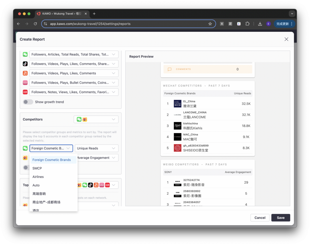 c. For competitor accounts, you can customize the selection of competitor groups and data metrics. The report will rank the top-performing competitor accounts in the group based on the metrics you choose.