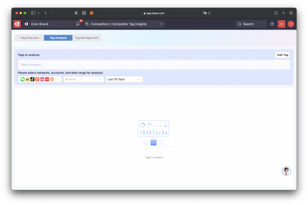 Under the Competitor menu, select the submenu Competitor Tag Analysis to open the Competitor Tag Overview page.Click the Tag Analysis button in the top navigation bar to switch to the Competitor Tag Analysis Report page.