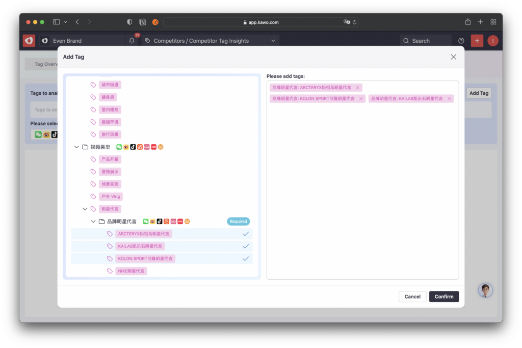 Click the Add Tags button on the right to open the tag selection window, then choose the tags you want to analyze.