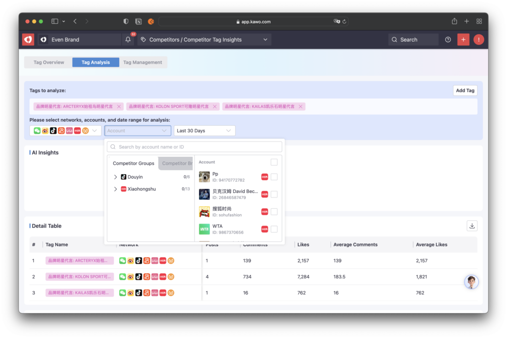 AI Overview: The system uses AI to automatically analyze post content and data under the selected tags,providing insights for a single tag or comparative results across multiple tags.