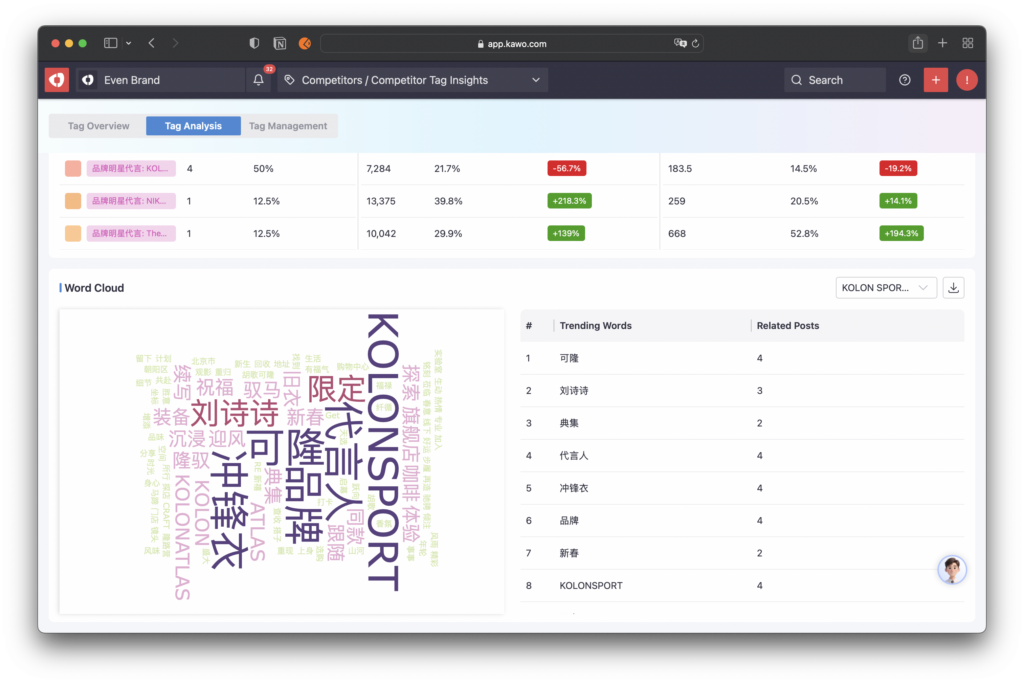 Content Word Cloud: The system automatically generates a word cloud of high-frequency words for each tag.You can intuitively view the core topics and frequency of posts under the tag, and efficiently identify trending topics from competitors.